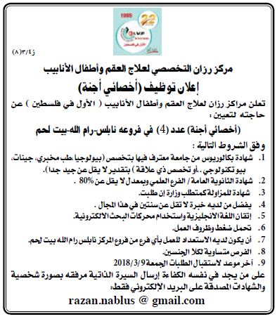 وظيفة شاغرة في مركز رزان التخصصي
