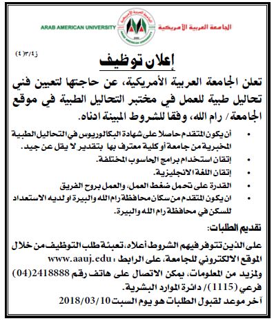 وظيفة شاغرة في الجامعة العربية الأمريكية
