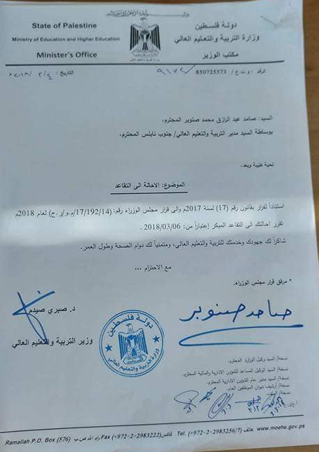 في اليوم الذي تلى تمديد مهمة رئيس هيئة مكافحة الفساد رفيق النتشة (84 عاماً)، تمت إحالة المعلم في مدرسة بيتا صامد صنوبر (31 عاماً) إلى التقاعد المبكر.