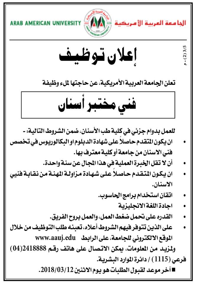 وظيفة شاغرة في الجامعة العربية الأمريكية