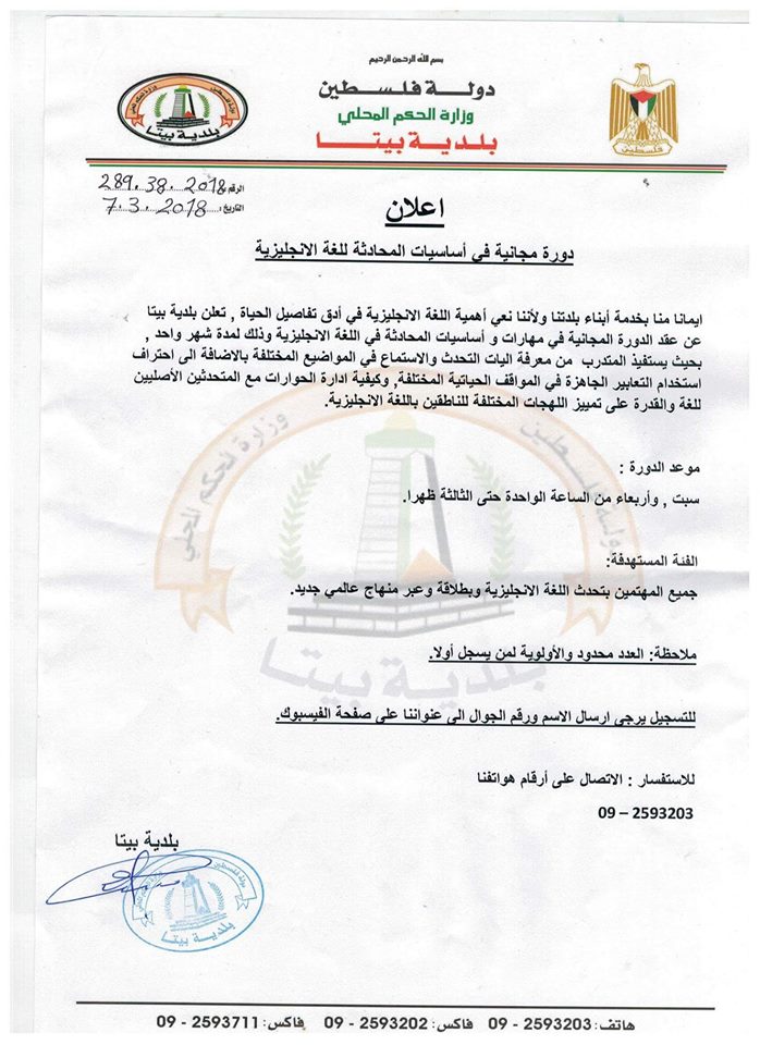 بلدية بيتا تعلن عن عقد دورة مجانية في مهارات وأساسيات اللغة الإنجليزية.