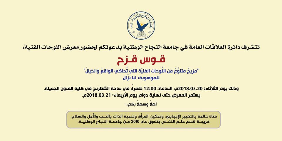 دعوة من جامعة النجاح لحضور معرض اللوحات الفنية "قوس قزح" للموهوبة لنا نزال.