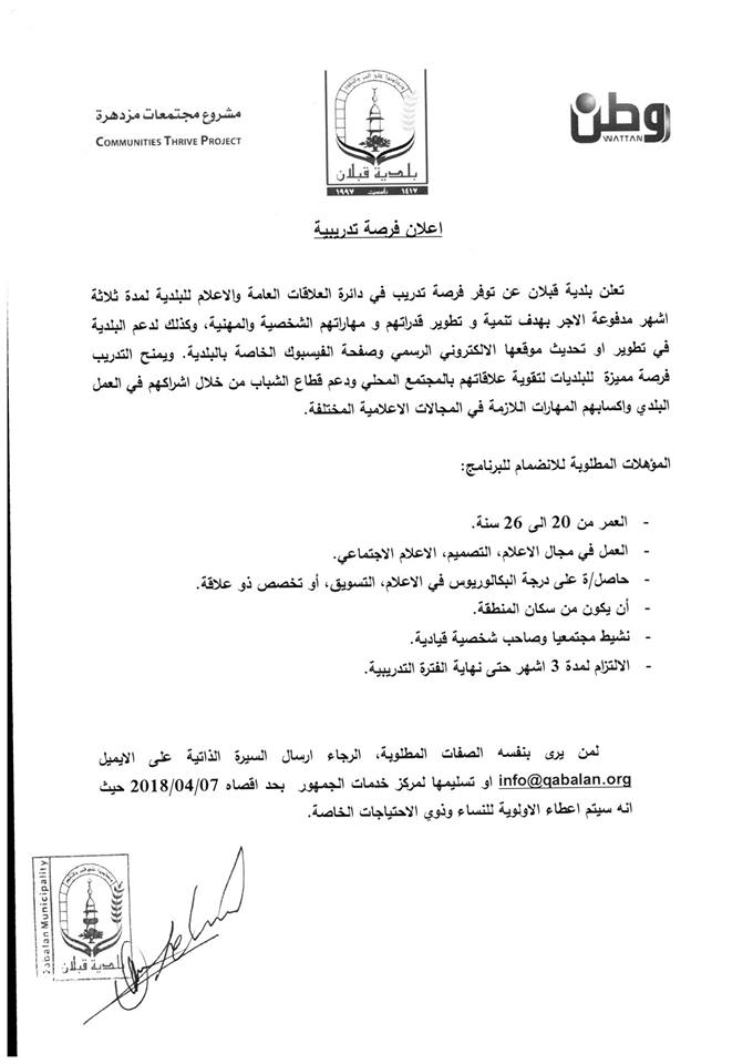 تقدم بلدية قبلان فرصة تدريب مدفوعة الأجر في دائرة العلاقات العامة والإعلام للبلدية مدة ثلاثة أشهر، آخر موعد للتقديم 7/4/2018 والأولوية للنساء وذوي الاحتياجات الخاصة.
