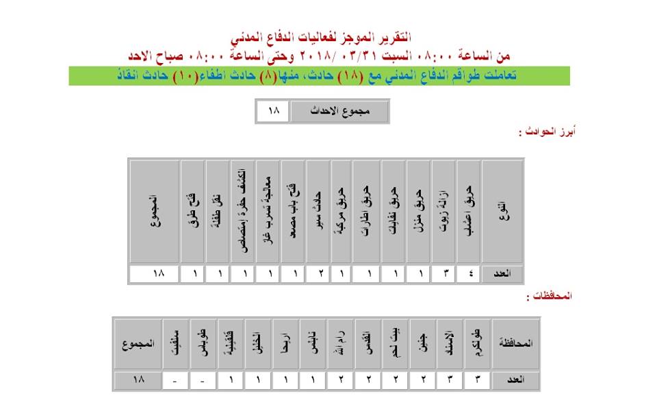 ملخص الحوادث التي تعاملت معها طواقم الدفاع المدني خلال يوم واحد من صباح السبت 31.3.2018 حتى صباح الأحد 1.4.2018.