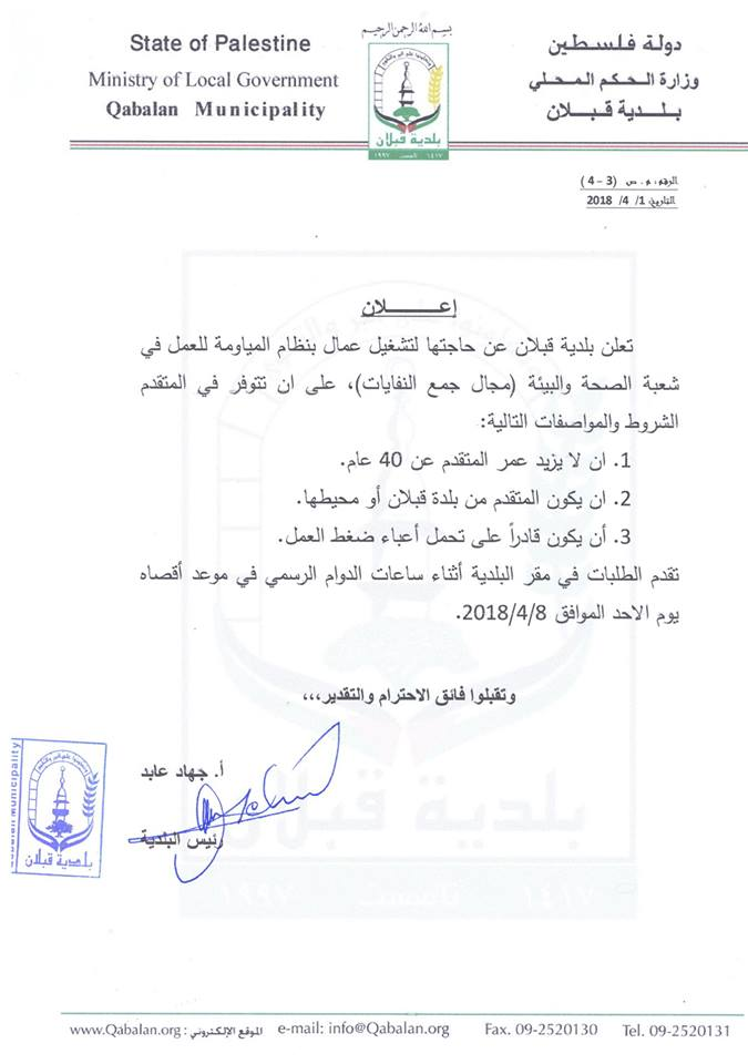 تعلن بلدية قبلان عن حاجتها لعاملين بنظام المياومة ويتم استقبال الطلبات حتى 8.4.2018.