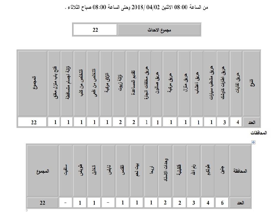 ملخص عدد الحوادث التي تعامل معها الدفاع المدني من صباح الاثنين 2.4.2018 حتى صباح الثلاثاء 3.4.2018.
