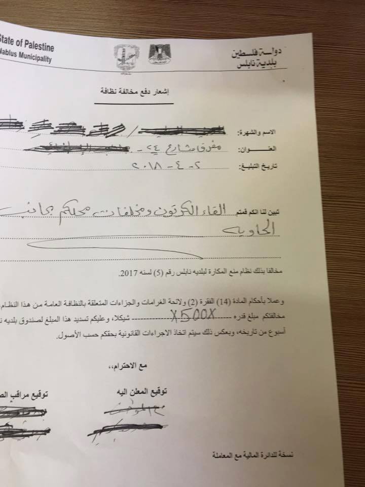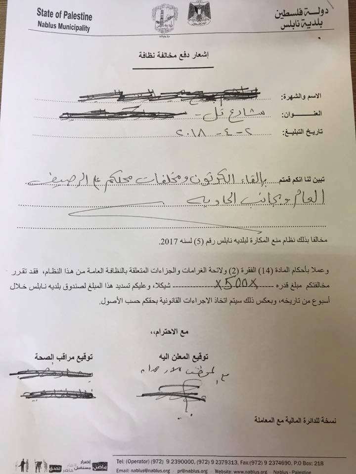 حررت بلدية نابلس مخالفة بسبب وضع كراتين محلات تجارية قرب الحاوية، بمبلغ 500 شيكل لكل محل.
