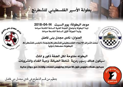 تحت إشراف الاتحاد الفلسطيني للشطرنج، يدعوكم نادي مجدل بني فاضل الرياضي ولجنة نابلس للشطرنج للمشاركة في بطولة يوم الأسير الفلسطيني للشطرنج السريع والتي ستتنطلق في مجدل بني فاضل يوم السبت الموافق 14/4/2018 الساعة 9 صباحا.