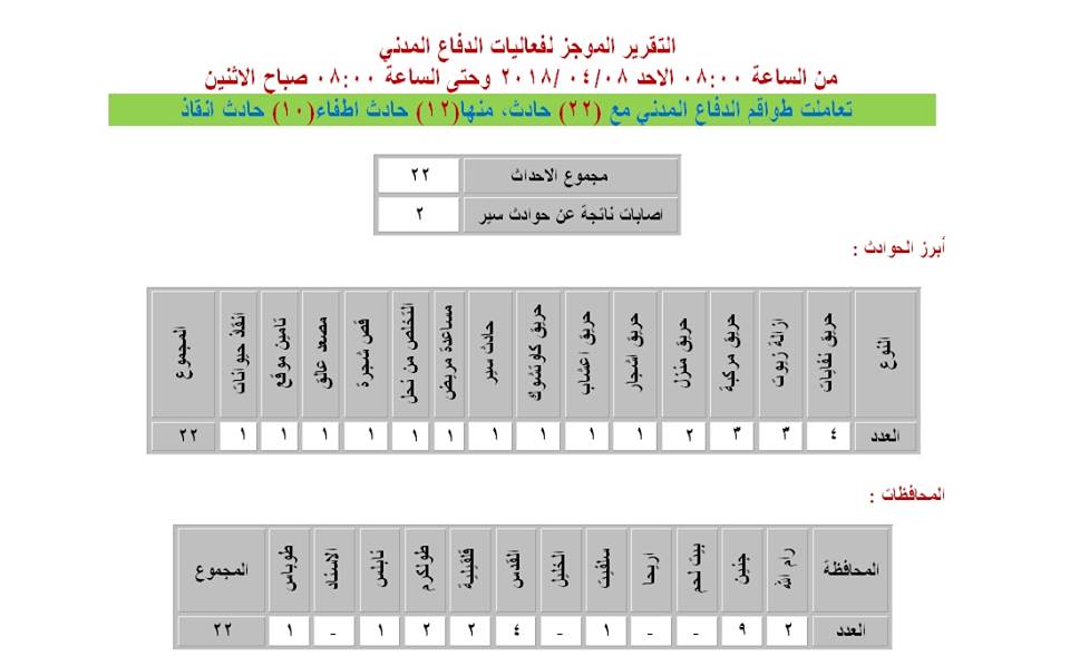 تعاملت طواقم الدفاع المدني خلال يوم الأحد 8.4.2018 حتى صباح الاثنين 9.4.2018 مع 22 حادثاً منها 12 حالة إطفاء وحوادث حرائق وعشر حالات تقديم مساعدة وحوادث إنقاذ في محافظات الضفة.