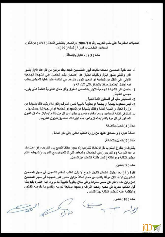 دوافع التعديلاتبدوره، أوضح عضو مجلس نقابة المحامين الفلسطينيين أمجد الشلة، "أنه جرى اجتماع بتاريخ 4.04.2018، للهيئة العامة للمحامين وتم إجراء تعديلات على نظام التدريب، ووافقت الهيئة العامة على هذه التعديلات".