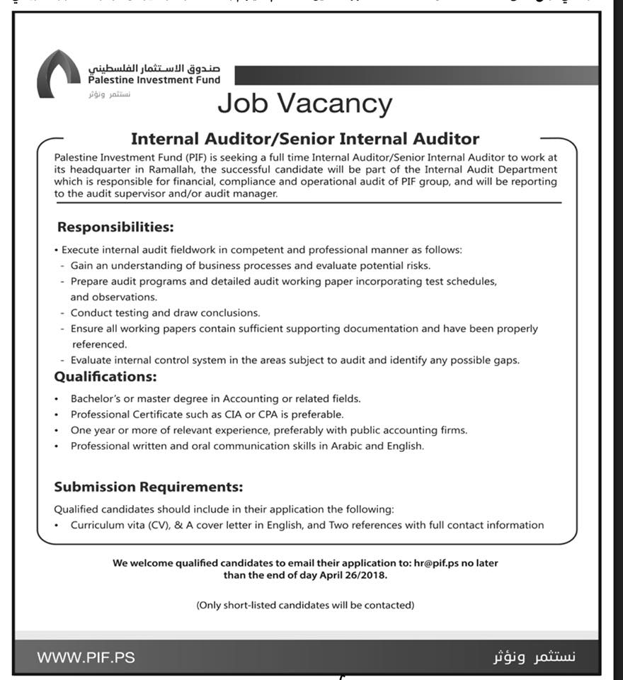 وظيفة شاغرة في صندوق الاستثمار الفلسطيني