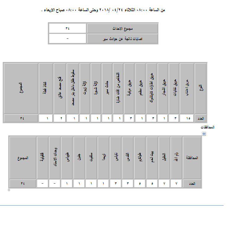 الدفاع المدني الفلسطيني ينشر موجز إنجازاته منذ صباح يوم الثلاثاء 24.04.2018، حتى صباح يوم الأربعاء 25.4.2018.
