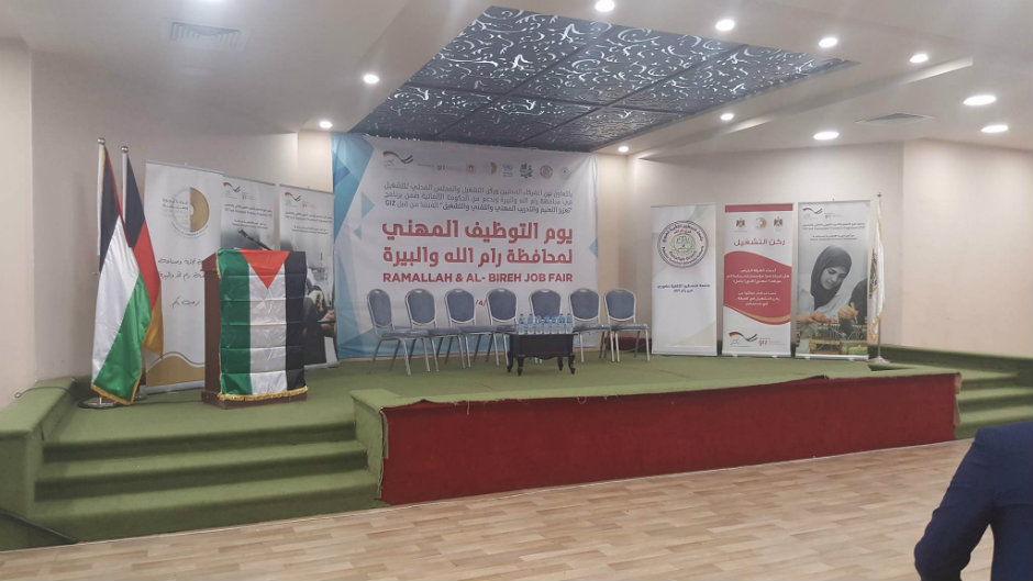 نظم شركاء من القطاع العام والخاص وبالشراكة مع المجلس المحلي للتشغيل والتدريب في قاعات منتزه البيرة في محافظة رام الله والبيرة وركن التشغيل في غرفة تجارة وصناعة محافظة رام الله والبيرة يوماً توظيفياً بدعم من الحكومة الألمانية ضمن برنامج "تعزيز التعليم والتدريب المهني والتقني والتشغيل" المنفذ من قبل GIZ.