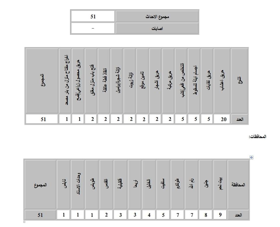 تعامل الدفاع المدني مع 51 حادثاً منذ صباح الأحد 6.5.2018 حتى صباح الاثنين 7.5.2018. ونشر تقريراً مفصلاً بذلك.