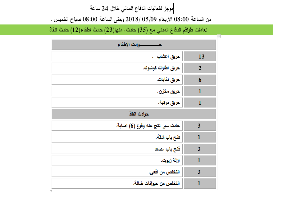 تعاملت طواقم الدفاع المدني مع 35 حادثاً، منها 23 حادث إطفاء و12 حادث إنقاذ من الساعة 08:00 صباح الأربعاء 09.05.2018، وحتى الساعة 08:00 صباح الخميس 10.05.2018.