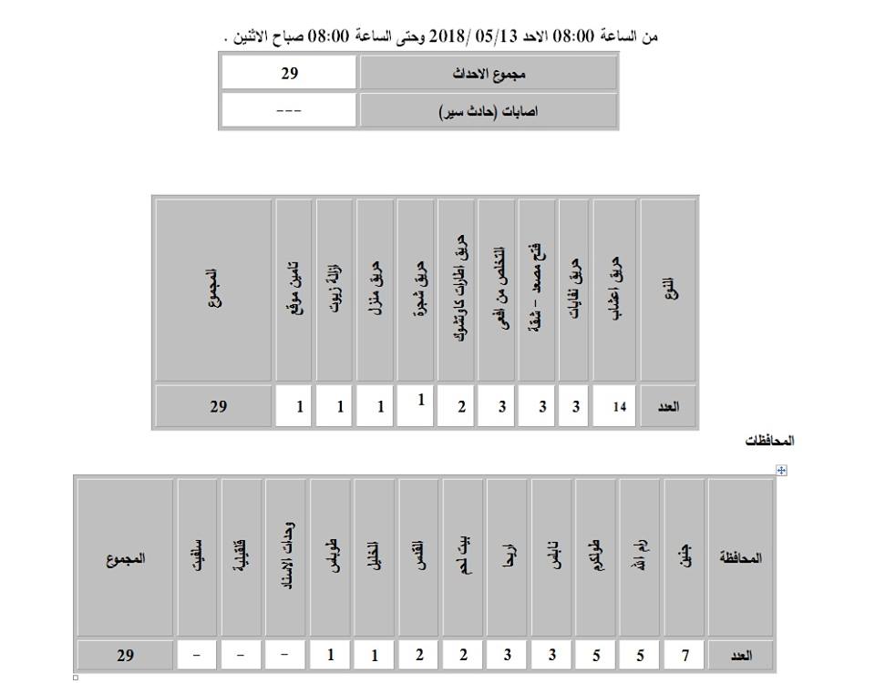 الدفاع المدني ينشر تقريراً بمجمل الحوادث، التي تعامل معها منذ صباح 13.05.2018 حتى صباح 14.05.2018.