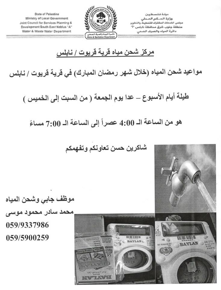 مجلس قروي قريوت في محافظة نابلس يحدد مواعيد شحن المياه خلال شهر رمضان.