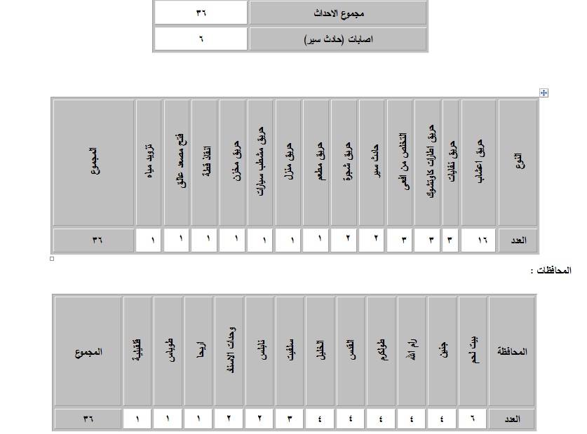 تعاملت طواقم الدفاع المدني خلال الـ24 ساعة الماضية مع 36 حادث إطفاء وإنقاذ، كان منها 28 حادث إطفاء وثمانية حوادث إنقاذ، ونتج عن حوادث السير ست إصابات.