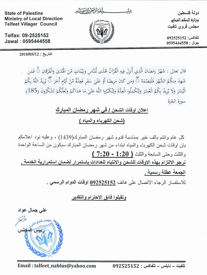 مجلس قروي تلفيت يحدد مواعيد شحن الكهرباء والمياه في شهر رمضان ويدعو المواطنين للالتزام بها.