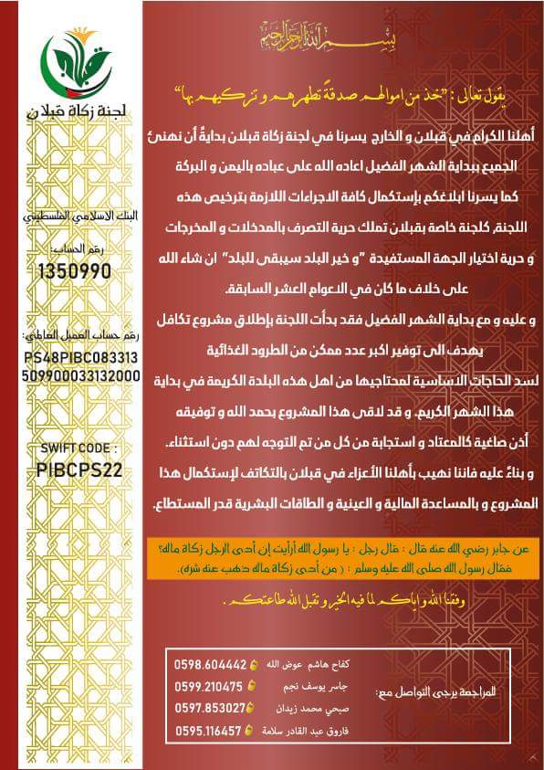 بلدية قبلان تعلن عن ترخيص لجنة زكاة بالبلدة وتدعو المواطنين بالمشاركة وتقديم المساعدات إلى مشروع تكافل.
