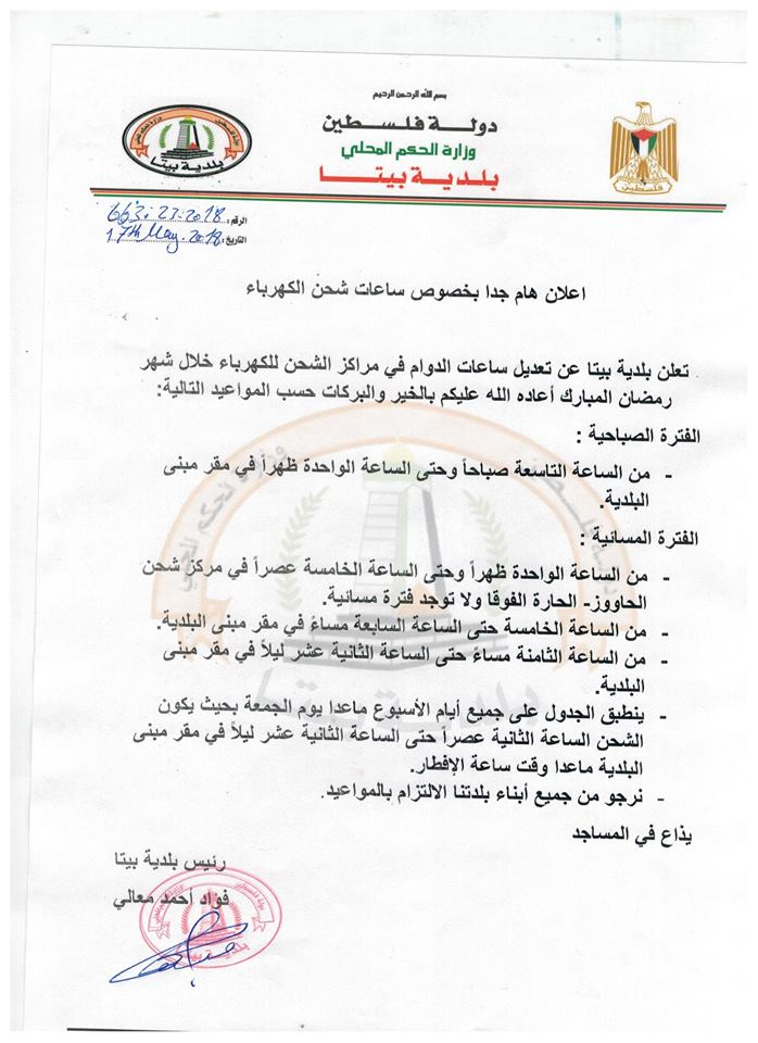 بلدية بيتا في محافظة نابلس تحدد ساعات شحن الكهرباء في شهر رمضان وتدعو المواطنين إلى الالتزام بالمواعيد.