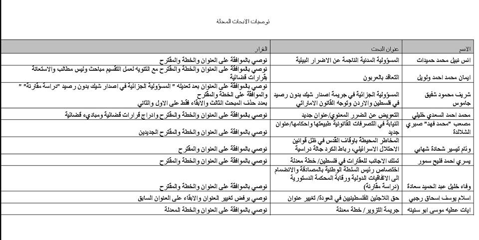 نقابة المحامين الفلسطينيين تنشر توصيات خطط الأبحاث للمتدربين.