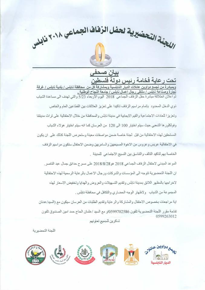نابلس.. بيان صادر عن اللجنة التحضيرية للزفاف الجماعي