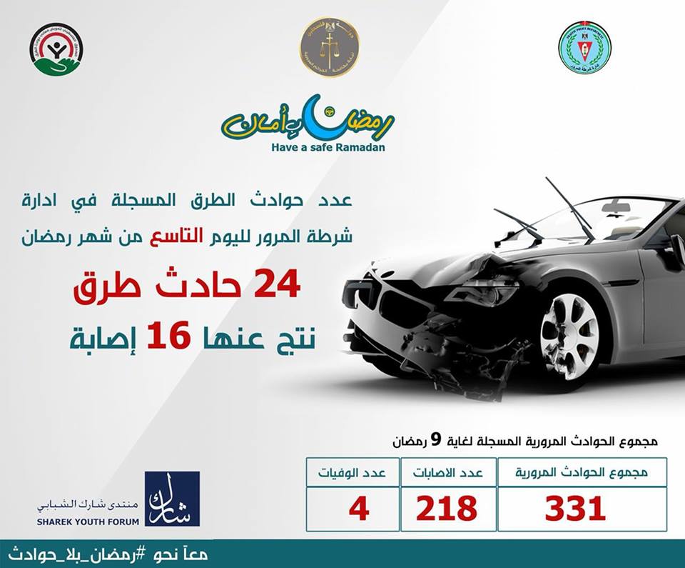 سجلت حملة رمضان بأمان لغاية التاسع من رمضان 331 حادث سير، نتج عنها 218 إصابة في محافظات الضفة الغربية.
