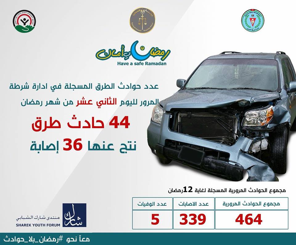 سجلت حملة رمضان بأمان لغاية الثاني عشر من رمضان، 464 حادث سير وخمس وفيات في محافظات الضفة الغربية.