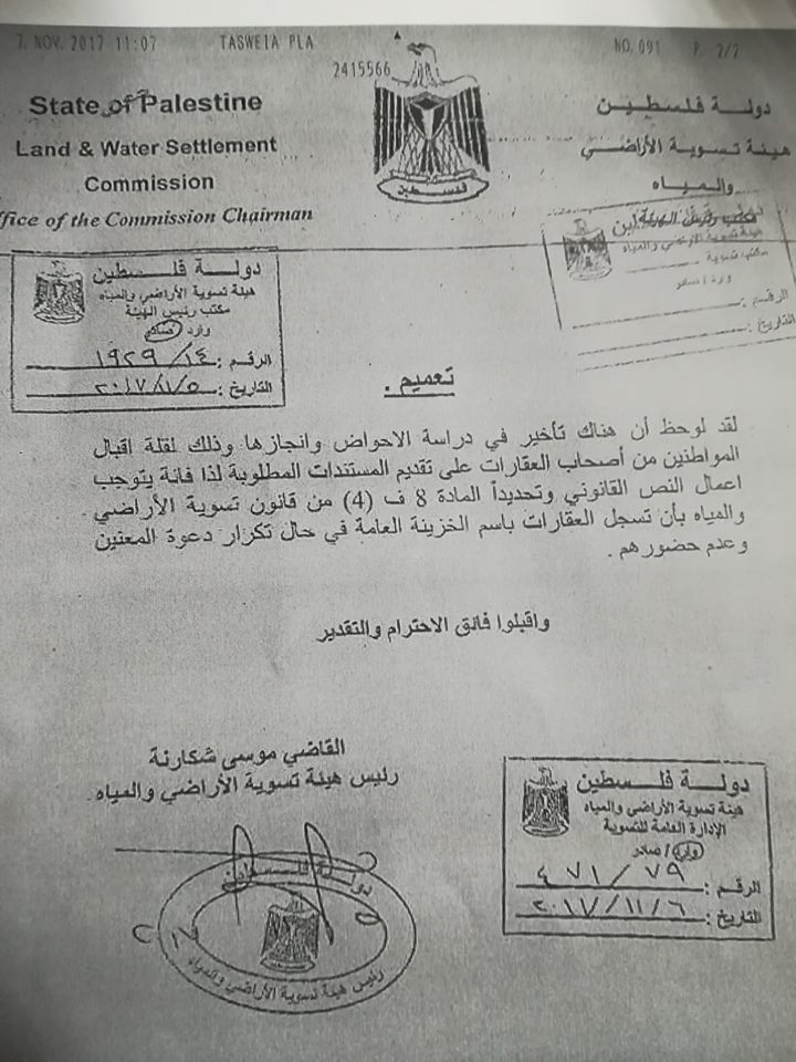 بيت دجن: تعميم بخصوص تسوية الأراضي