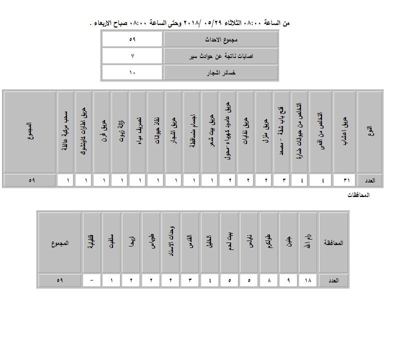 تعاملت طواقم الدفاع المدني مع 59 حادثاً، منها 41 حادث إطفاء و18 حادث إنقاذ، من الساعة 08:00 صباح الثلاثاء 29.05.2018 وحتى الساعة 08:00 من صباح اليوم الذي يليه.