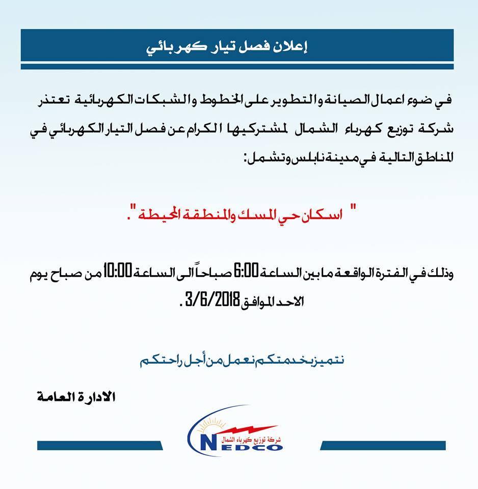 قطع التيار الكهربائي لمدة أربع ساعات في منطقة حي المسك غربي مدينة نابلس والمنطقة المحيطة به، يوم الأحد 03.06.2018.