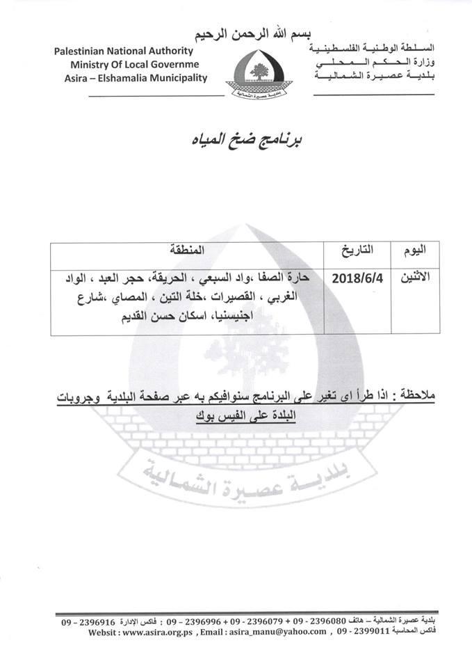 جدول توزيع المياه في عصيرة الشمالية ليوم الاثنين 04.06.2018.