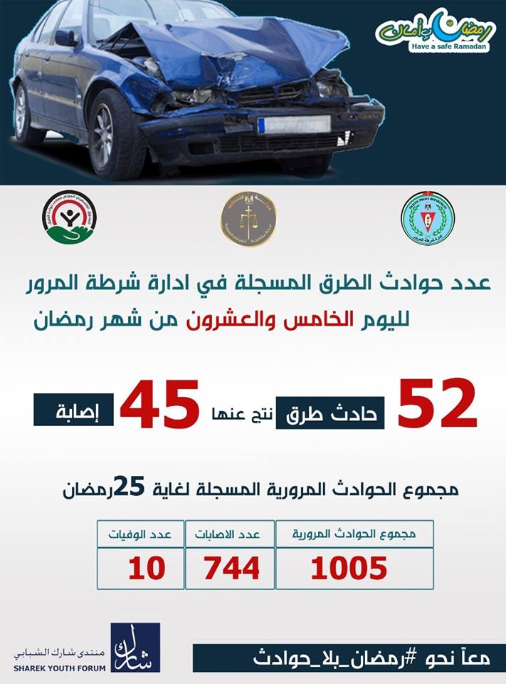 حملة رمضان بأمان تشير إلى وقوع 52 حادث سير في اليوم الخامس والعشرين من شهر رمضان.