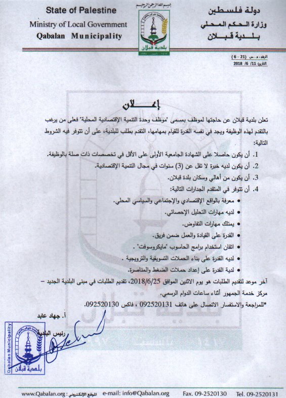 وظيفة شاغرة في قبلان - نابلس