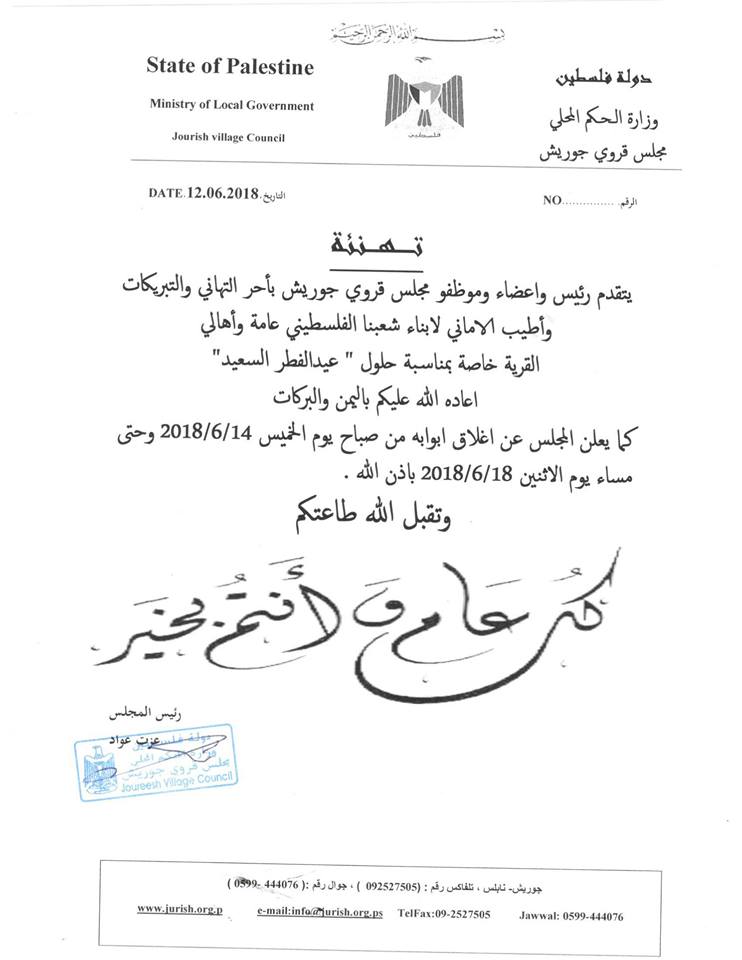 مجلس قروي جوريش يعلن عن إغلاق أبوابه في عطلة عيد الفطر.