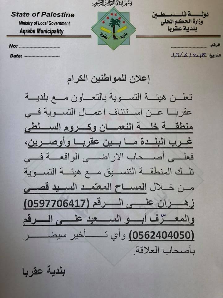 هيئة تسوية الأراضي في بلدة عقربا تعلن عن استكمال أعمال التسوية في منطقتي خلة النعمان وكروم السلطى.