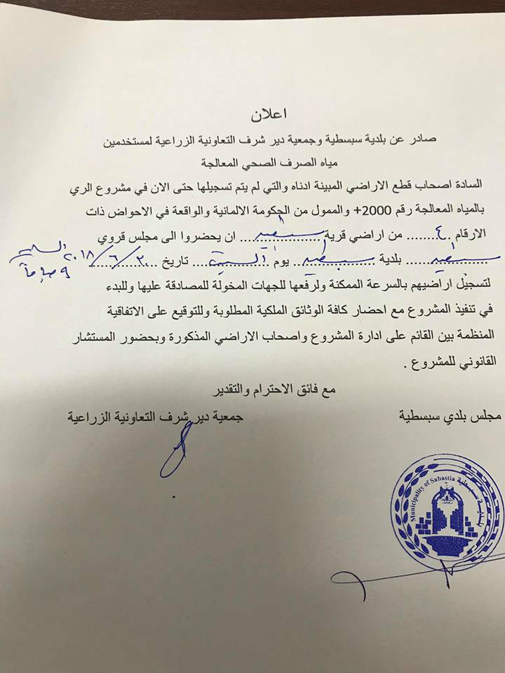 بلدية سبسطية تحدد موعد تسجيل الأراضي في مشروع الري بالمياه المعالجة وتدعو المزارعين للمسارعة بالتسجيل.
