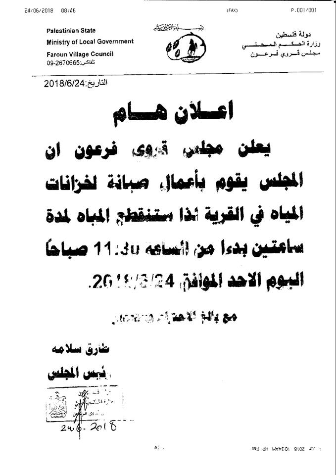 مجلس قروي فرعون يعلن عن قطع المياه مدة ساعيتن يوميا عن القرية بسبب أعمال صيانة خزانات المياه.