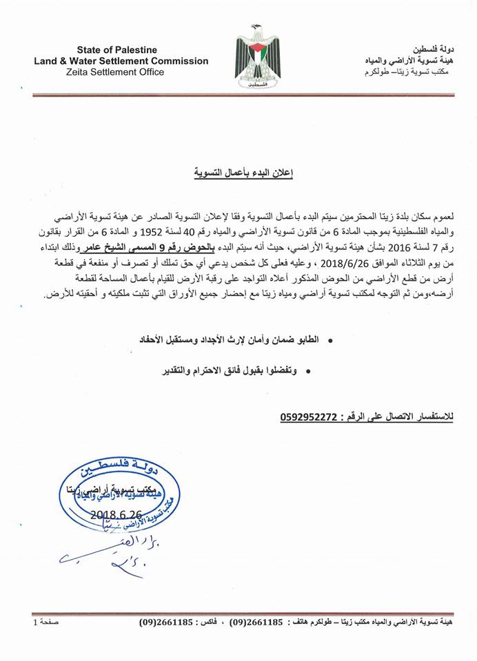 مكتب تسوية زيتا في طولكرم يعلن البدء بأعمال تسوية الحوض رقم 9 ابتداءً من الثلاثاء 26.06.2018.