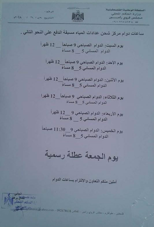 مجلس قروي رامين ينشر ساعات وأيام شحن المياه مسبقة الدفع.