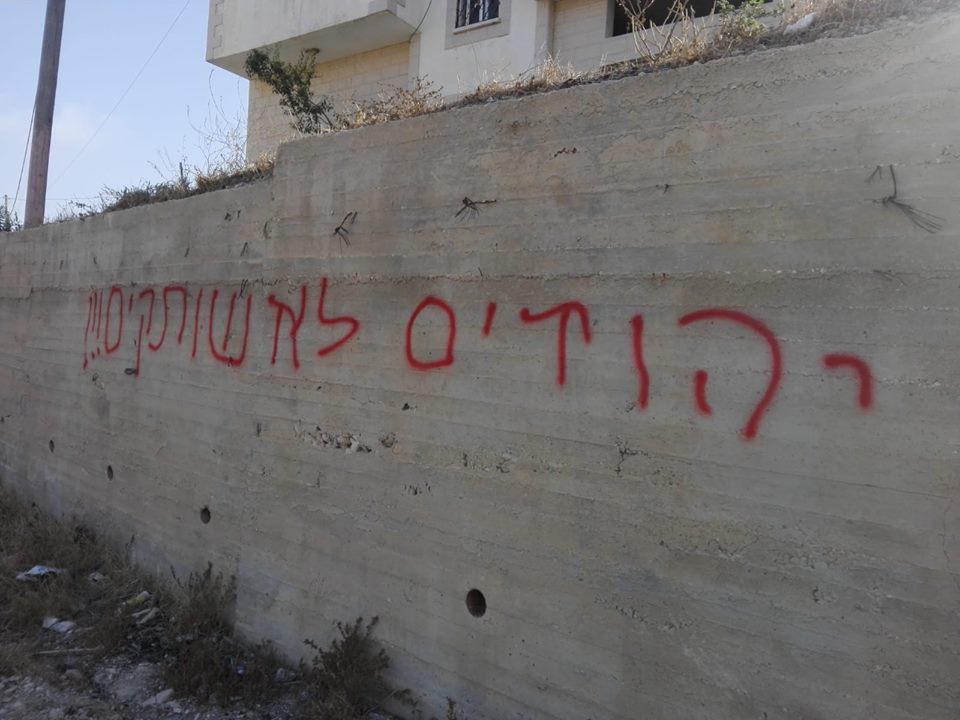 وأفاد مسؤول ملف الاستيطان شمال الضفة غسان دغلس بأن مستوطني "يتسهار" تسللوا فجراً إلى القرية وأعطبوا إطارات مركبتين تعودان للمواطن غالب رضوان عامر (59 عاماً) ونجله محمود (25 عاماً) وخطوا شعارات عنصرية تهدد بالقتل والموت للعرب على جدران بركس لمواطن آخر.