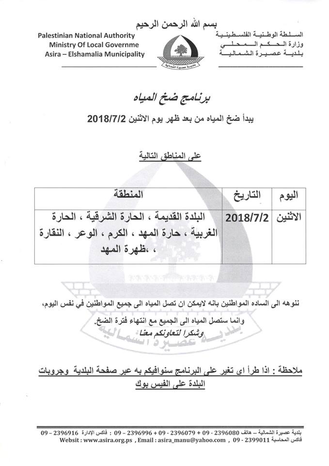 جدول توزيع المياه في عصيرة الشمالية ويبدأ ضخ المياه في يوم الاثنين 02.07.2018.