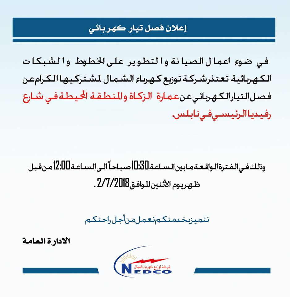 شركة توزيع كهرباء الشمال تنشر مناطق فصل التيار الكهربائي ليوم الاثنين 02.07.2018 في مدينة نابلس.