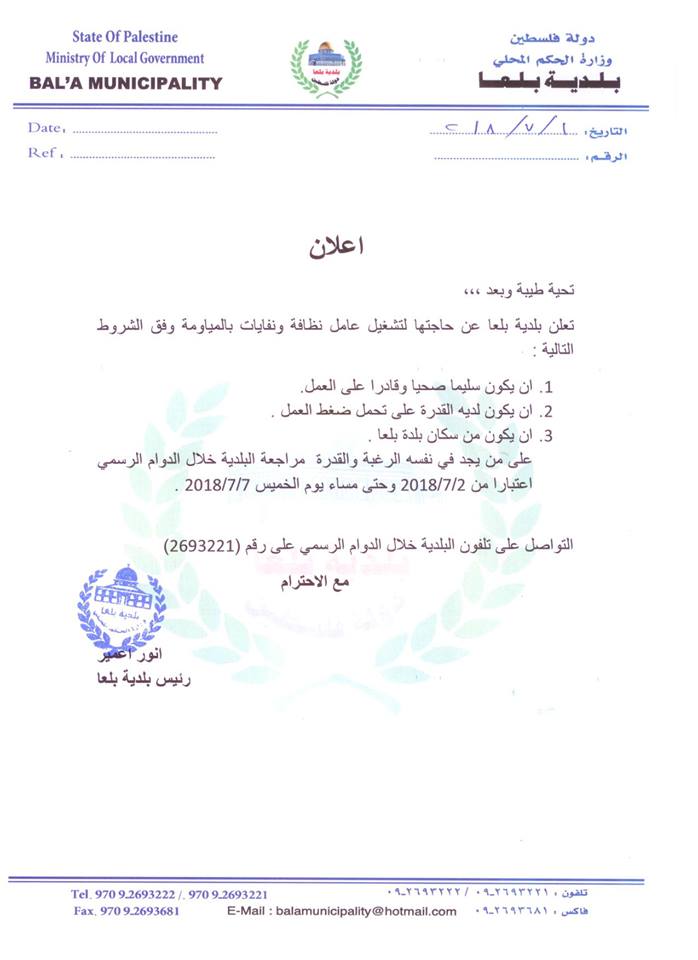 مطلوب عامل نظافة لبلدية بلعا قضاء طولكرم.