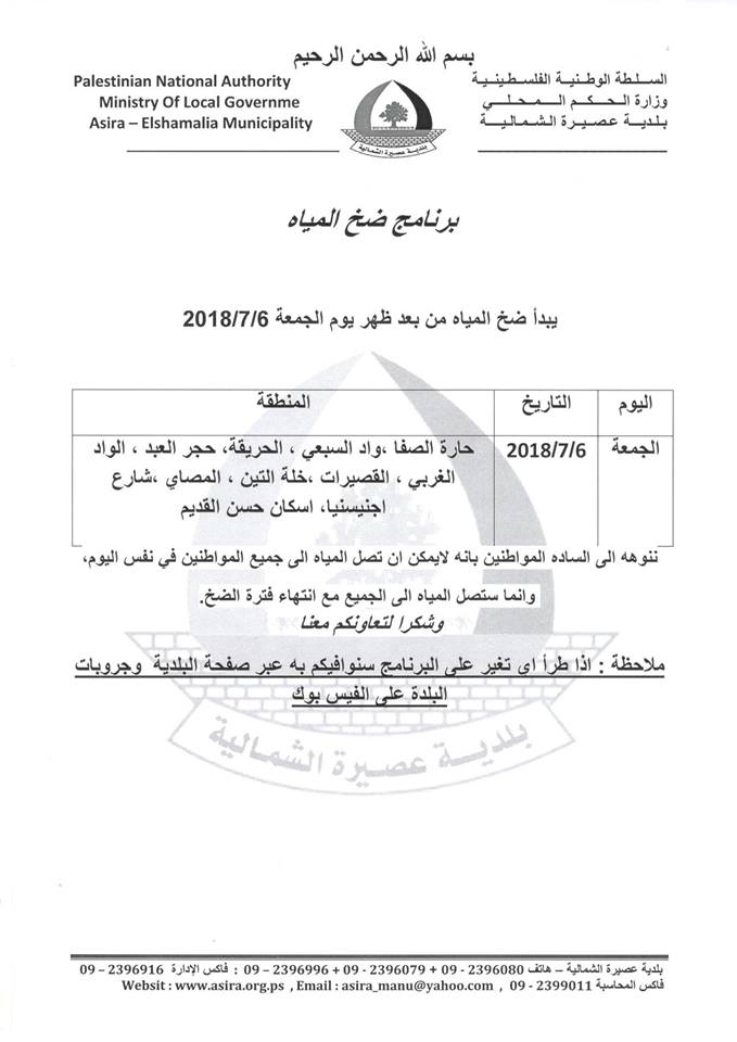 جدول توزيع المياه في بلدة عصيرة الشمالية ويبدأ الضخ من بعد ظهر الجمعة 06.07.2018.