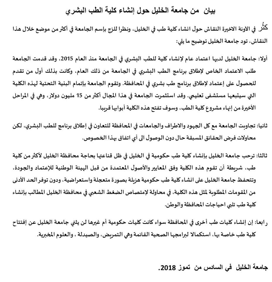 جامعة الخليل تنشر بياناً حول إنشاء كلية الطب البشري، وتوضح أنها حصلت على اعتماد بإنشائها منذ عام 2015.