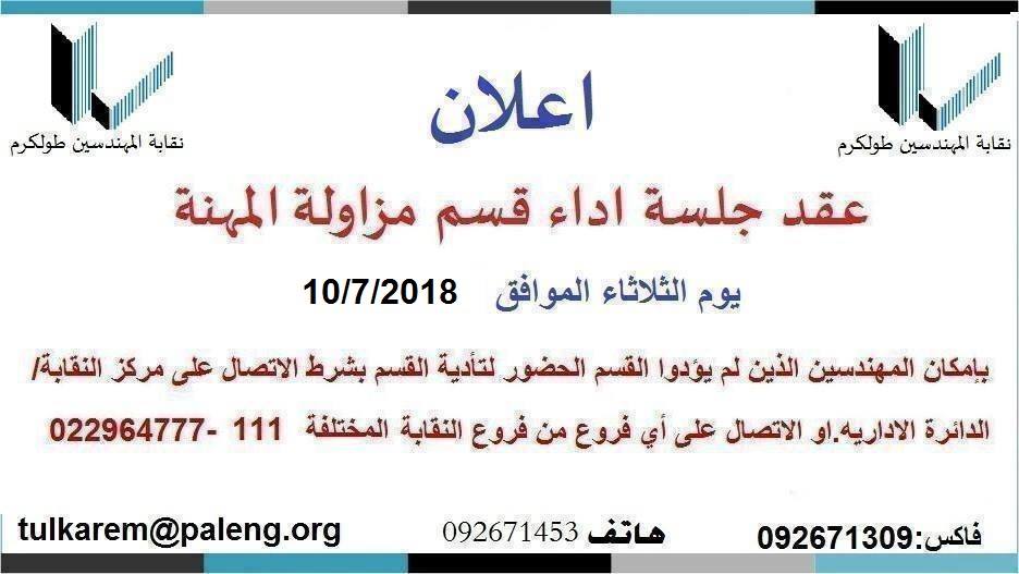 تعلن نقابة المهندسين إلى الزملاء والزميلات التالية أسماؤهم في محافظة طولكرم