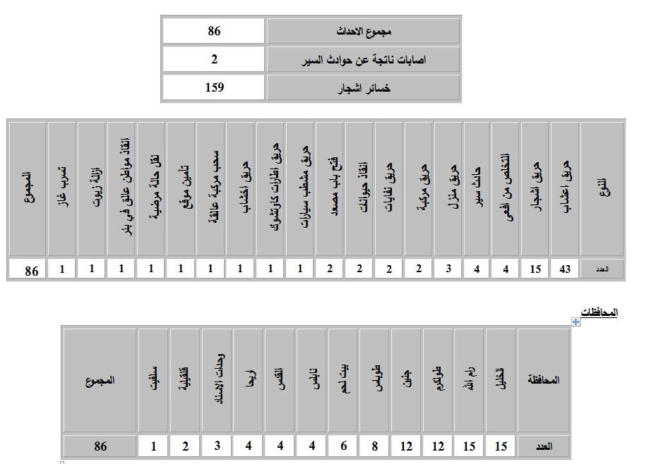تعاملت طواقم الدفاع المدني من صباح يوم الأحد 08.07.2018، حتى صباح يوم الاثنين 09.07.2018، مع 86 حادث إطفاء وإنقاذ، كان منها 68 حادث إطفاء و18 حادث إنقاذ.