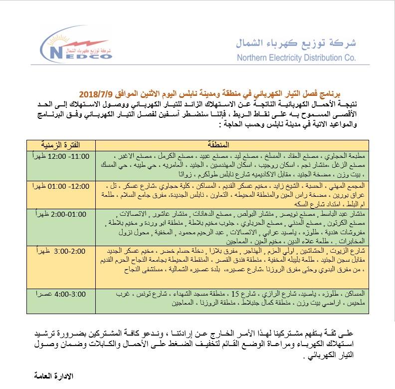 شركة توزيع كهرباء الشمال تعلن عن برنامج قطع التيار في محافظة نابلس ليوم الاثنين 09.07.2018.